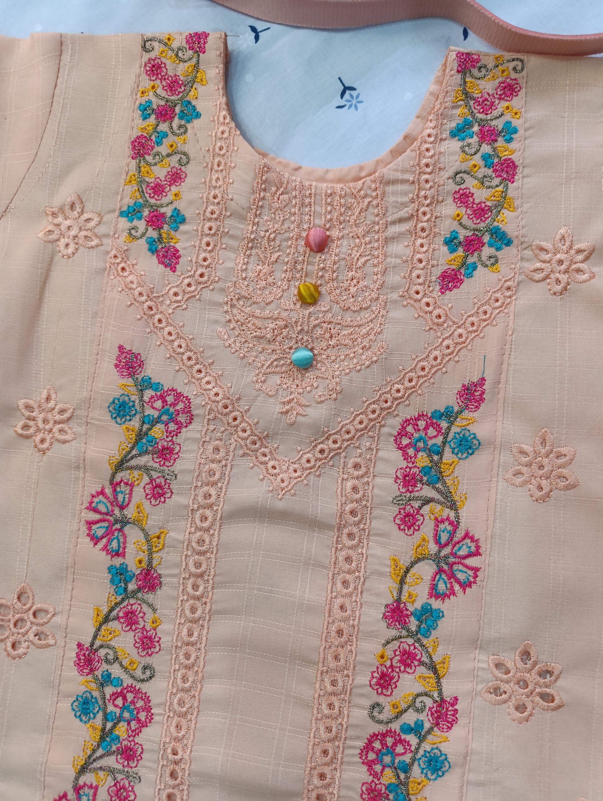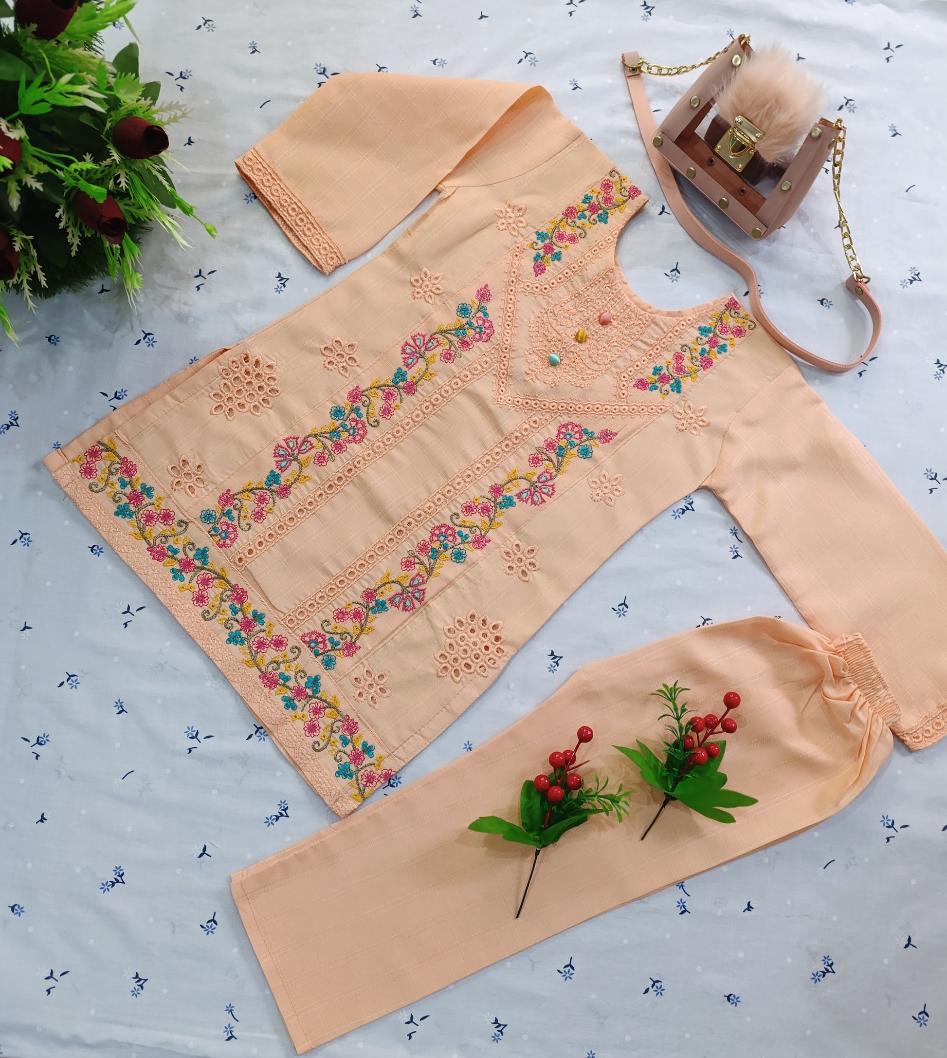 Girls Embroidered Lawn Suit – Peach with Chikankari Work